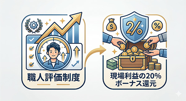 • 担当した現場で出た利益のうち、20%を個人に還元。