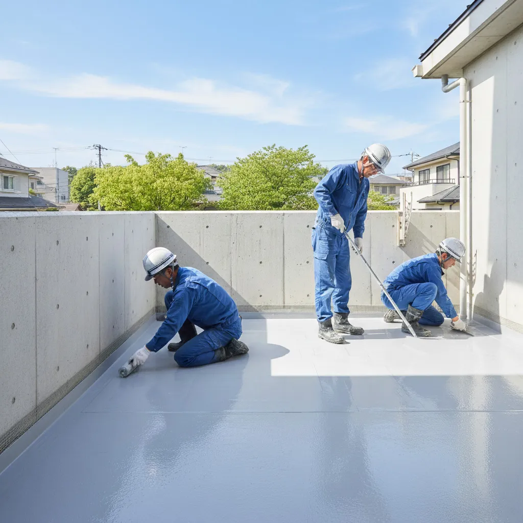 当社では、小さなひび割れや防水層の剥がれも見逃さず早めに補修対応いたします。ウレタン塗膜防水・FRP防水・シート防水・アスファルト防水など、建物や下地の状況に応じたさまざまな防水工法に対応しており、高い技術力を持つ職人が責任をもって施工します。防水工事の良し悪しは下地処理で決まると言われるほど重要ですので、下地の清掃や下地調整を入念に行い、新しい防水材がしっかり密着するよう細心の注意を払っています。防水層を施工した後は、水を一滴も通さないよう丁寧に仕上げ、必要に応じてトップコートで保護します。